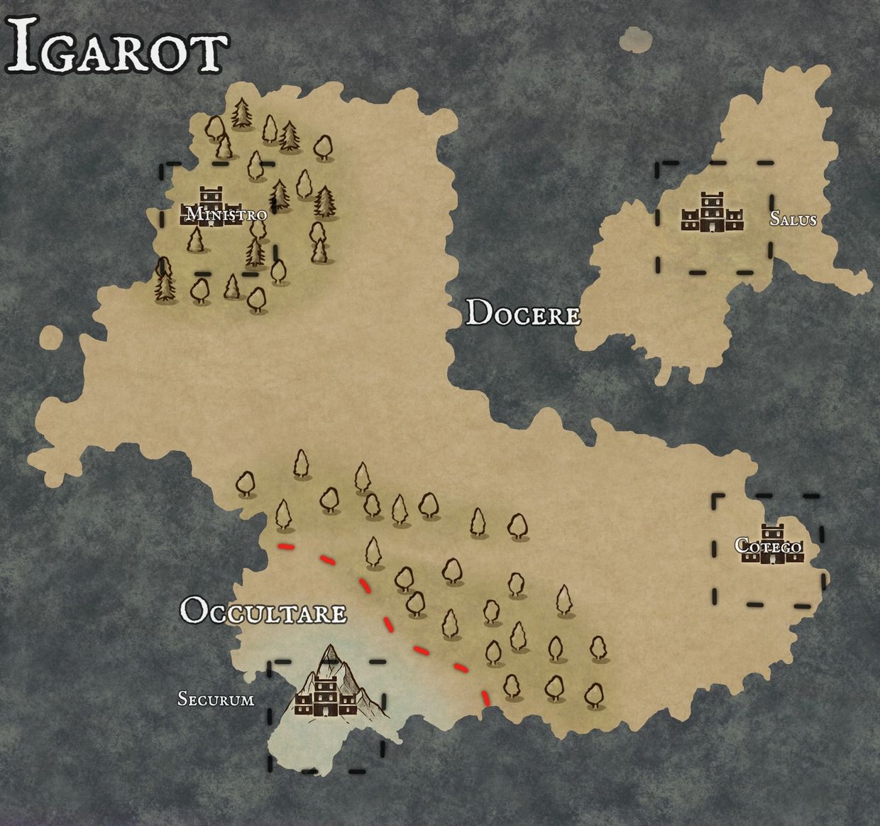 Most of Igarot's land belongs to the country of Docere, with only a small portion belonging to Occultare. Docere has three towns within it, the Northwestern town of Ministro, the island town of Salus, and the Southern town of Cotego, each with their own specializations that their people tend to focus on. There are a few thick forests around their lands, but most of their lands are fairly clear and plains like, with certain parts of it well trampled by large animals, and a large portion of the Salus island being covered in farm lands. Salus island the the northern part of the main country tend to be warmer, some parts staying above 75 degrees Fahrenheit, while the lower regions can drop down to being much colder with the average being around 35 degreed. Their weather patterns are rather mild, though as many of their people are magically inclined, it's believed that any bad instances of weather are reduced or prevented altogether. Occultare's land is small and has very little greenery, bordered by the end of a forest towards Docere, quickly fading to a stony part then an almost completely frozen over area, with no visible structures of buildings on any of their land. Temperatures there are very cold, rarely getting over 35 degrees Fahrenheit for most of their land, and snowfall being very common.